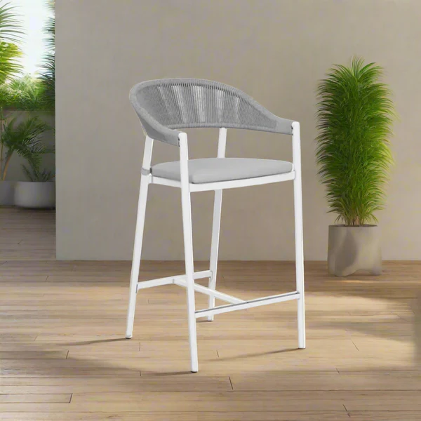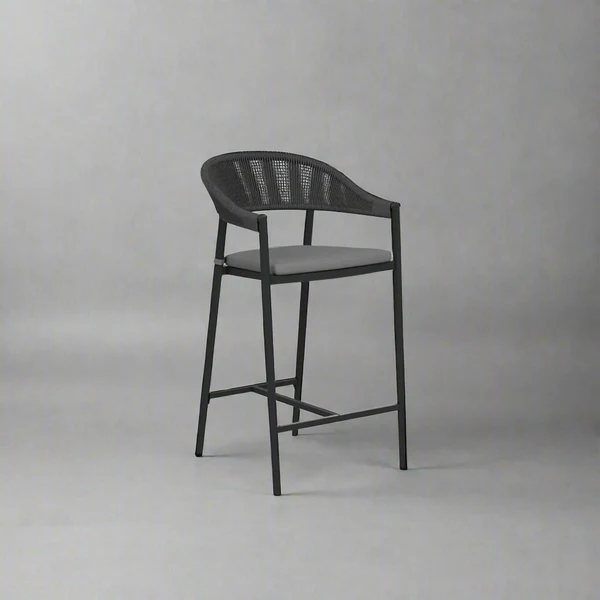 يجمع التصميم بين الحداثة والعملية، مما يجعله مثاليًا للمساحات الداخلية والخارجية. تأتي الكراسي بلون أحبال أسود مع قماش رمادي أنيق يضيف لمسة فاخرة لأي ديكور سواء في كافيه راقٍ أو مطعم مفتوح. التصميم المريح والمقعد المرتفع يمنح تجربة جلوس مثالية للعملاء لفترات طويلة.