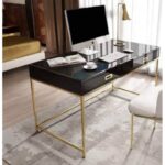 مكتب ستانلس ستيل بطلاء PVD لامع وخشب HPL أسود من e-metallic يجمع بين الجودة والفخامة في تصميم عملي وعصري: